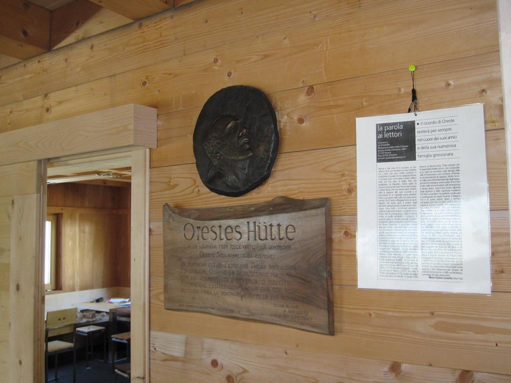 l rifugio - Orestes Hütte - è dedicato alla memoria di Oreste Squinobal. Come di ritorno da un’arrampicata si appendono al piolo in rifugio la piccozza e i moschettoni; così, nell’intrattenimento prima o dopo l’escursione, si appiglia la conversazione al moschettone del ricordo per un’escursione nella memoria. Oreste Squinobal (1942-2004), insieme con Arturo Squinobal, ha formato una cordata che, negli anni 1970-1980, si è imposta come tra le più forti e preparate d’Europa: realizzarono, tra l’altro, alcune “prime invernali”, di valore “estremo”, tra cui la “direttissima” alla parete sud del Cervino-Matterhorn, nel 1971, la cresta integrale di Peutérey al Monte Bianco, nel 1972, la “direttissima” alla punta Signal-Gnifetti del Monte Rosa, nel 1978, la parete ovest del Cervino-Matterhorn, nel 1978. Insieme anche con il fratello Renzo vinse il trofeo Mezzalama nel 1975, Nel 1982 Oreste raggiunse la vetta del Kanchenjunga (m. 8.596) senza ossigeno, in “stile alpino”. Uomini “Walser” di personalità complessa, questi, di cui Oreste fu un esemplare mirabile: montanaro, cresciuto ed educato fin da fanciullo, all’Alpe Cialvrina, ai lavori duri della “ruralità” montana, poi artista falegname, esperto carpentiere, fidato costruttore, ed insieme guida alpina (come gli avi Johan, Niklaus, Peter-Joseph Knubel e Antonio Curta) e, last but not least, grande alpinista. Impigliato nel moschettone del ricordo, come lo stelo d’un fiore di roccia, c’è il suo sorriso, il suo sguardo penetrante, il suo entusiasmo vibrante e incantevole come il sibilo di un “assolo” di tromba (eseguito, come Lui usava fare, su “in alto”, nel “vento dei quattromila”).