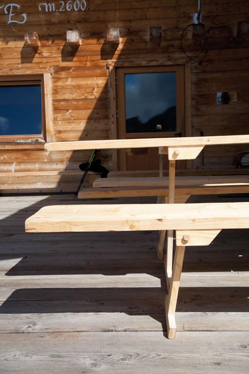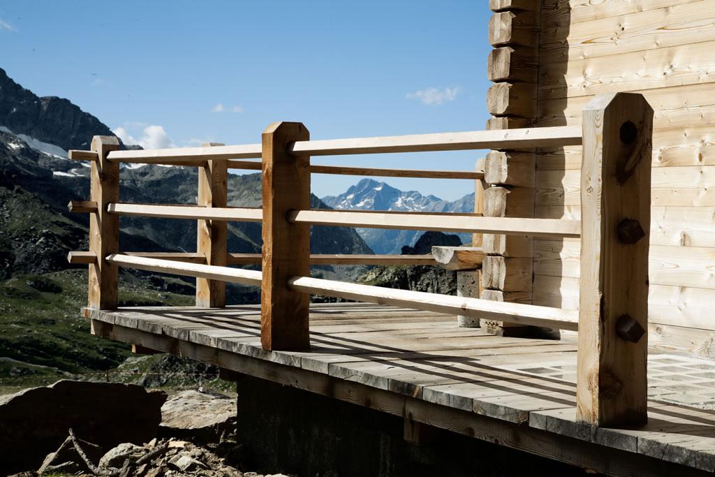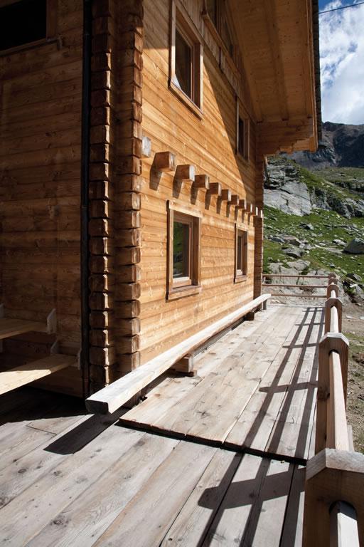 Anche solo a vederlo, il rifugio “parla” di come è stato costruito: concepito per incorporare in sé la sapienza, antica e naturale, del legno (il larice delle selve del Monte Rosa, coi suoi profumi, i suoi nodi, le sue vene che s’innervano nell’incastro a “block-bau” che regge gli spigoli del rifugio). La natura ha trovato così, nell’opera dell’uomo, la formazione di un “luogo” in cui regna il retaggio vivente della sua intrinseca sapienza.